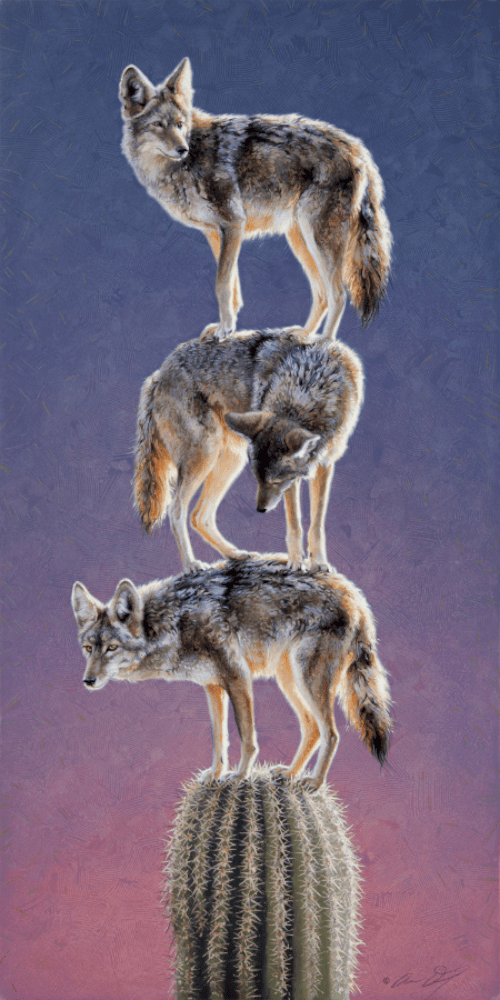 “Totem #19: Stacked Coyotes, Desert Dusk” by wildlife artist Andrew Denman. Click here to learn more about this piece.